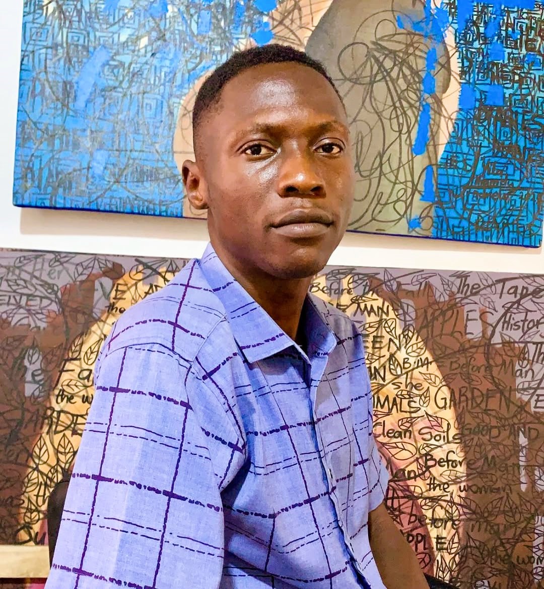 Alhamdu Andrew is a figurative painter from Nigeria. He was born and raised in the Northern part of Nigeria. His father is a graphic artist and that introduced him to drawing at a young age. However, it was not until much later in his teenage years that art became a passion and pursuit for him. Despite coming from an artistic background, studying and practicing to become an artist was an uphill challenge he had to achieve through sheer determination and resilience because of several environmental hinderances. He is a graduate of the famous Zaria Art School where he obtained a Degree in Fine Art specializing as a Painter and a Masters degree in Art History. He currently lives and practices as a full-time studio artist in Abuja, Nigeria. Alhamdu has participated in group exhibitions both within and outside Nigeria. He has also had a solo exhibition dubbed “Intimate Notes”. His works continue to be extensions of his many ponderings and contemplations on the human experiences he observes in his environment. And his style of painting gives him the duality of expression both in imagery and handwritten text. Hence, the appellation ‘The Writing Painter’.
